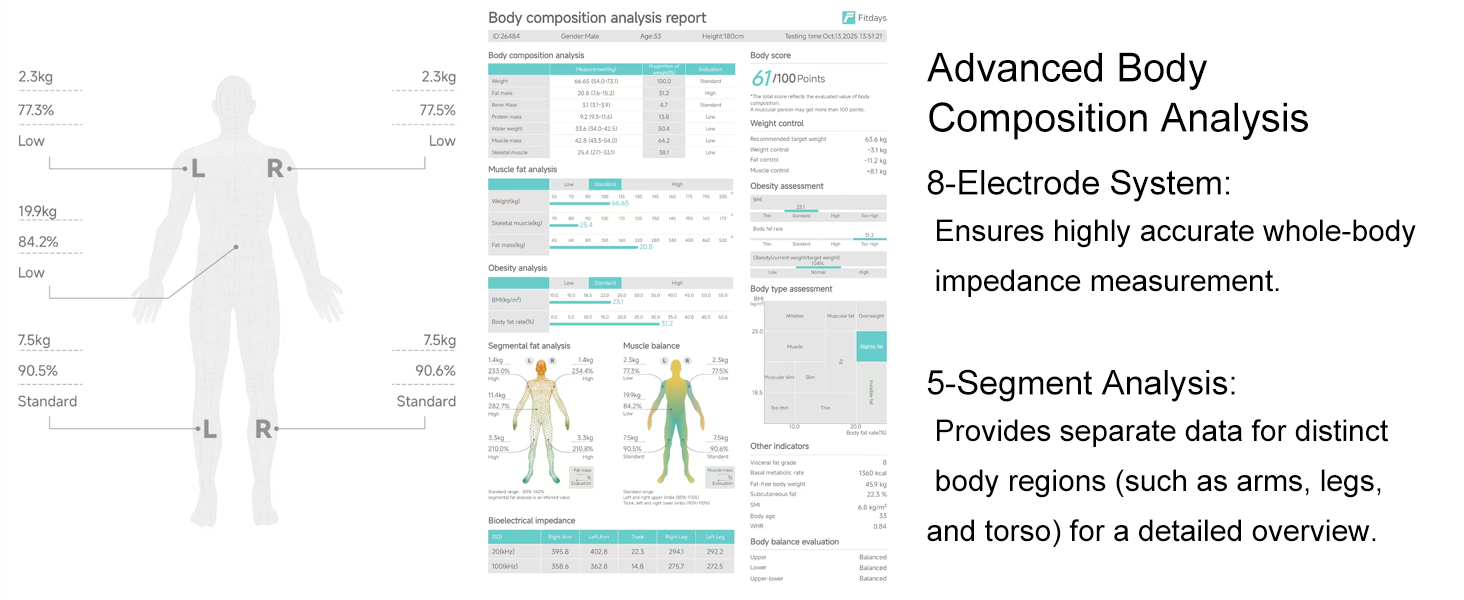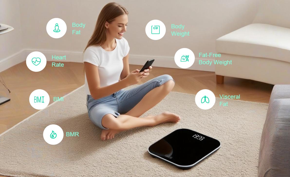 BMI (Body Mass Index),Fat-Free Mass (Lean Body Weight),Body Fat Distribution,Body Fat Percentage,Basal Metabolic Rate (BMR),Fat Mass,Body Water Percentage,Body Fat Trend Analysis,Weight,Visceral Fat Level,Muscle Percentage,Protein Content...